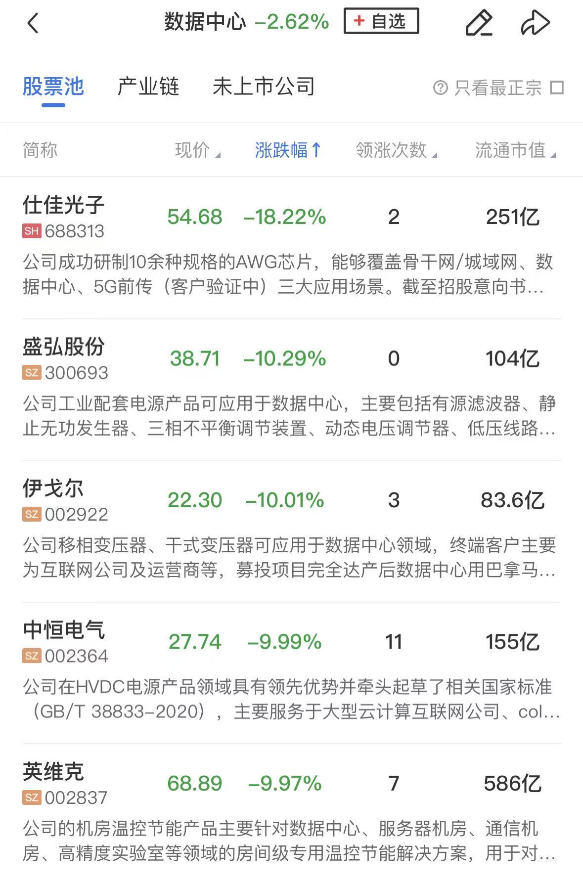 数据中心概念股全线走弱,盛弘股份跌超10%、中恒电气跌停,科士达、欧陆通、英可瑞、麦格米特跌幅居前。