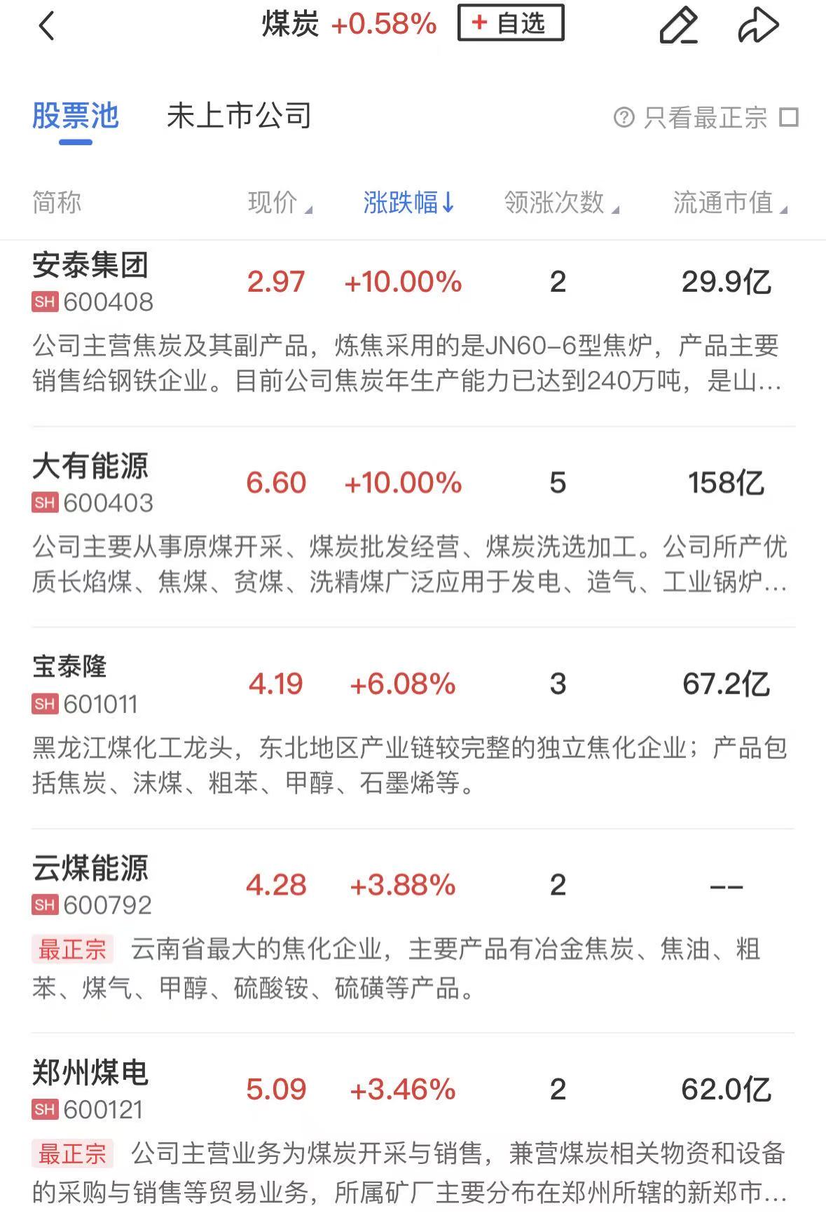 板块上,煤炭板块持续逆势,大有能源6天5板,安泰集团、郑州煤电、兖矿能源等涨幅居前。