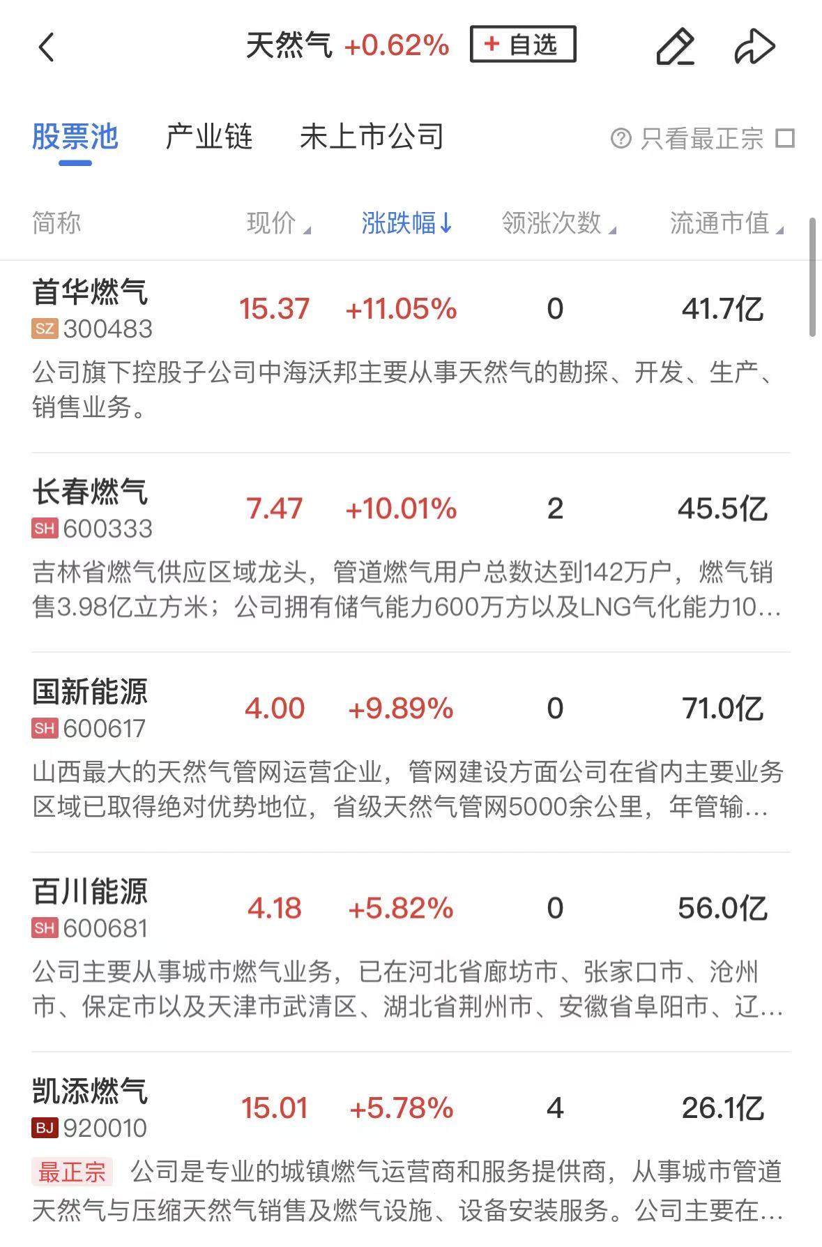 燃气板块异动拉升,长春燃气、国新能源涨停,凯添燃气、百川能源、洪通燃气涨幅居前。消息面上,为应对连续降温,甘肃等多地提前启动冬季供暖工作,随着冬天供暖模式开启,天然气需求旺季到来。