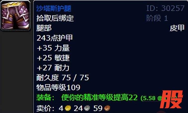 第二款给到的是任务“送往沙塔斯的特殊货物”奖励的沙塔斯护腿,这东西是最容易被近战物理职业给遗漏的极品精准腿了,特别是很多大兄弟做任务选择奖励的时候,满眼都是盯着哪几个金币看,高的直接选了扔商店,所以喵叔也是再次提醒各位大兄弟,在虚空风暴开启这个任务做到最后一环传送沙塔斯的时候,一定要眼睛看仔细了,尤其是狂暴战大兄弟,初期就是你补充竞争的最强皮甲装备了,喵叔100%推荐!